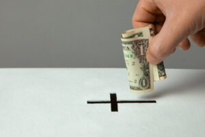 Man puts donation in his hand with dollar in slot in the form of Christian cross. Copy space for text