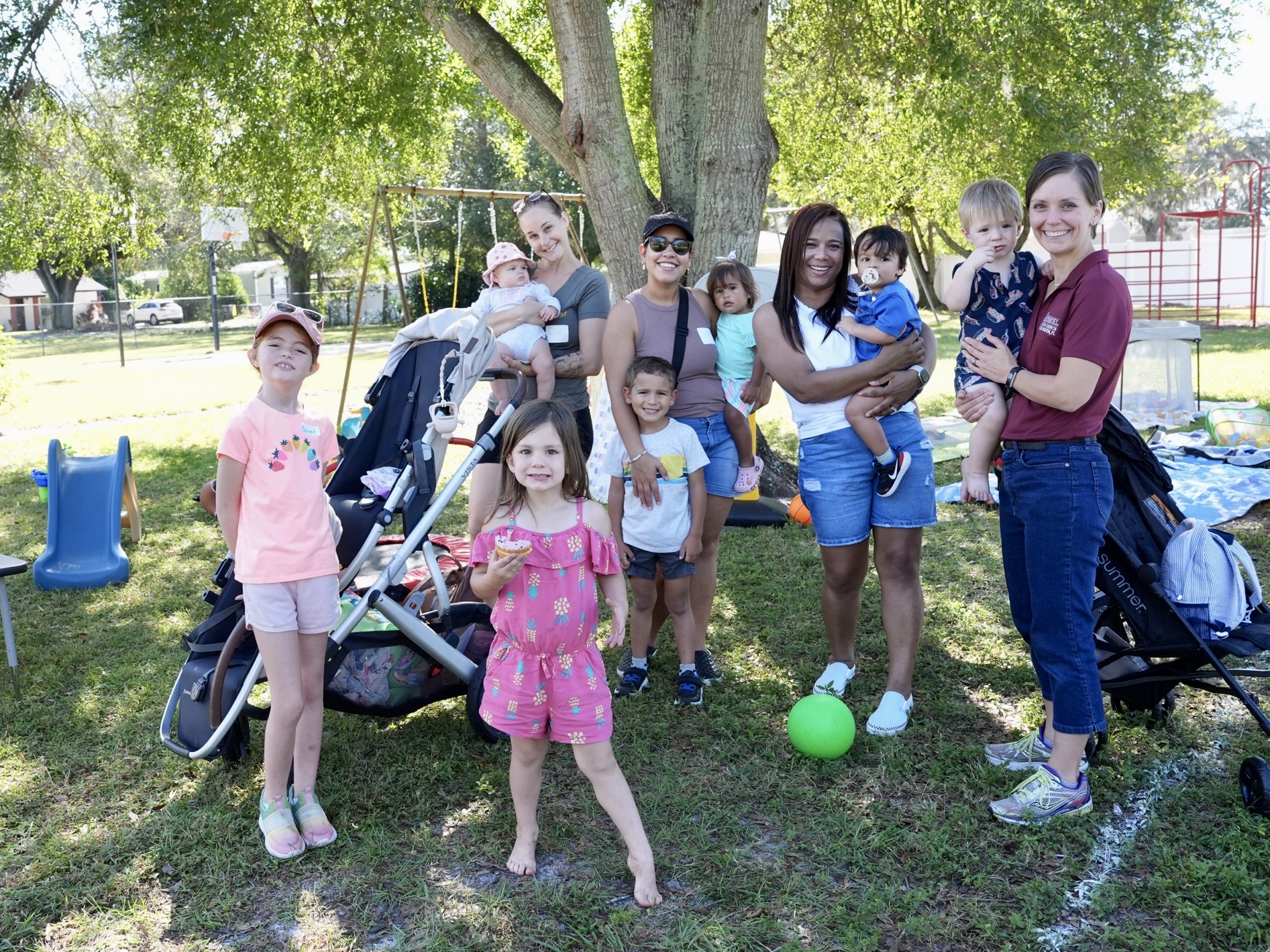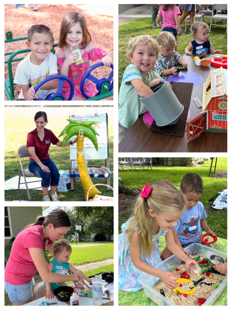 We’ll start on the provided lawn blankets with circle time for 15-20 minutes. The teacher will lead songs, stories and activities that moms can do with their kiddos. Then we’ll have 40 minutes of free play time—a themed craft, toddler toys, baby swings and slide, sensory bin, etc. A snack is also provided for the littles!